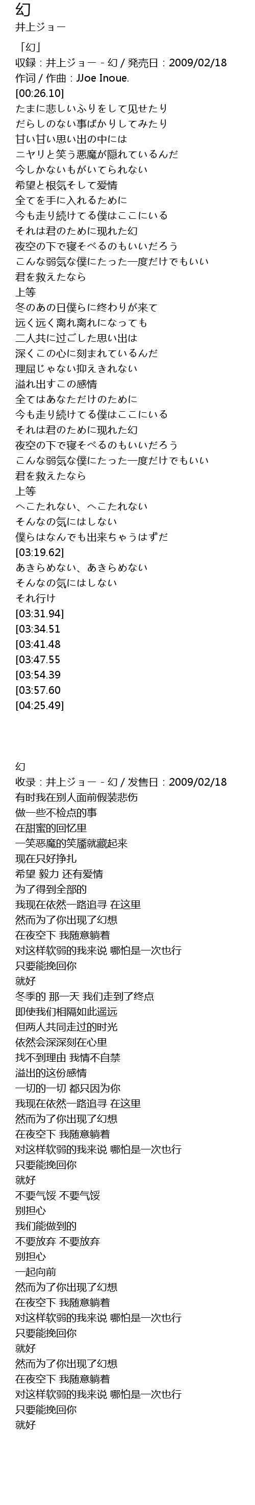 | [00:04.00] | 收录:井上ジョー - 幻/发售日:2009/02/18 |