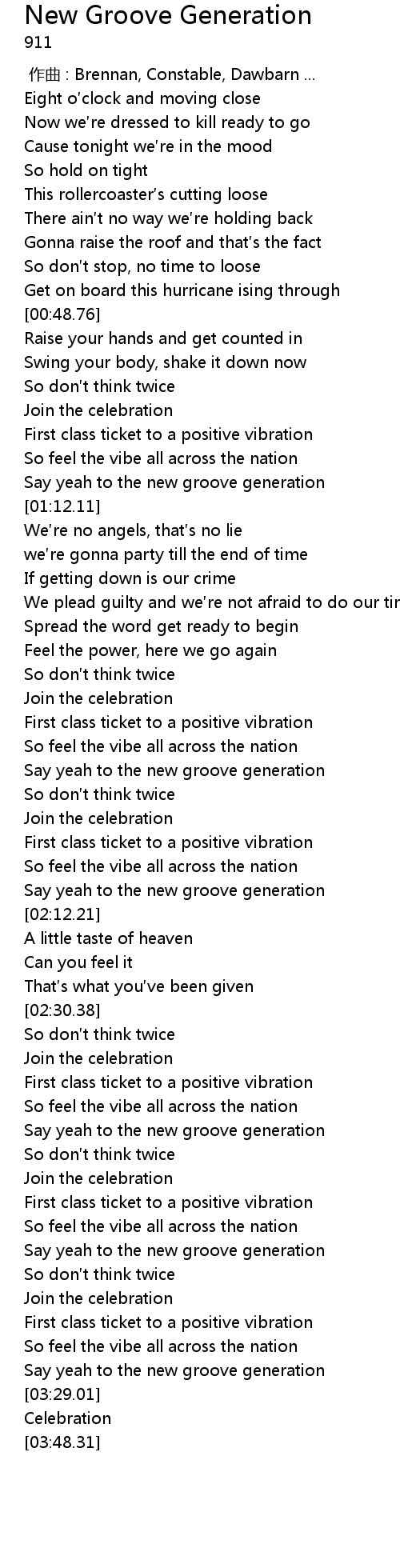 | [02:54.61] | Say yeah to the new groove generation |
