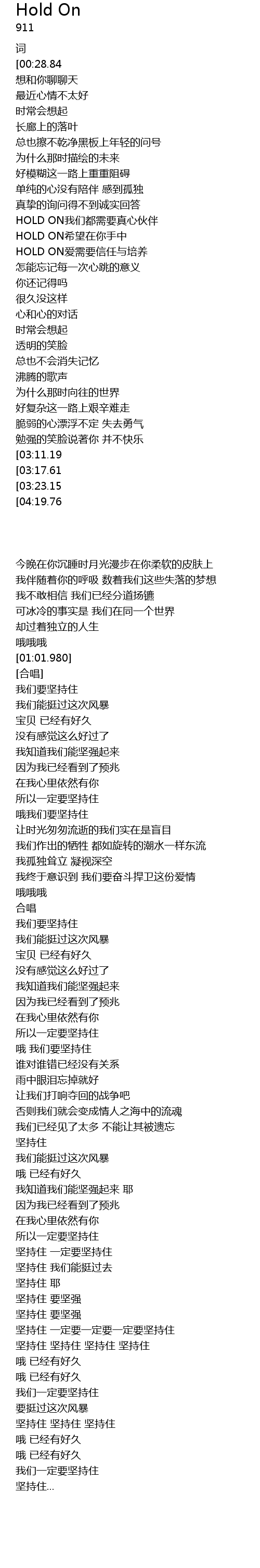 | [04:13.67][03:23.15][02:57.40] | HOLD ON ai xu yao xin ren yu pei yang |
