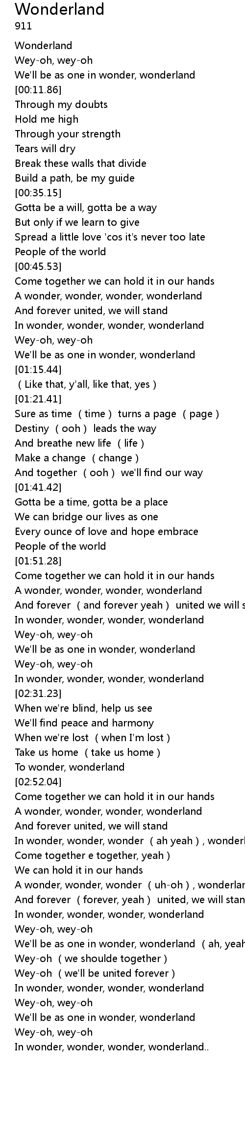 | [03:17.75] | A wonder, wonder, wonder uhoh, wonderland oh, yeah |