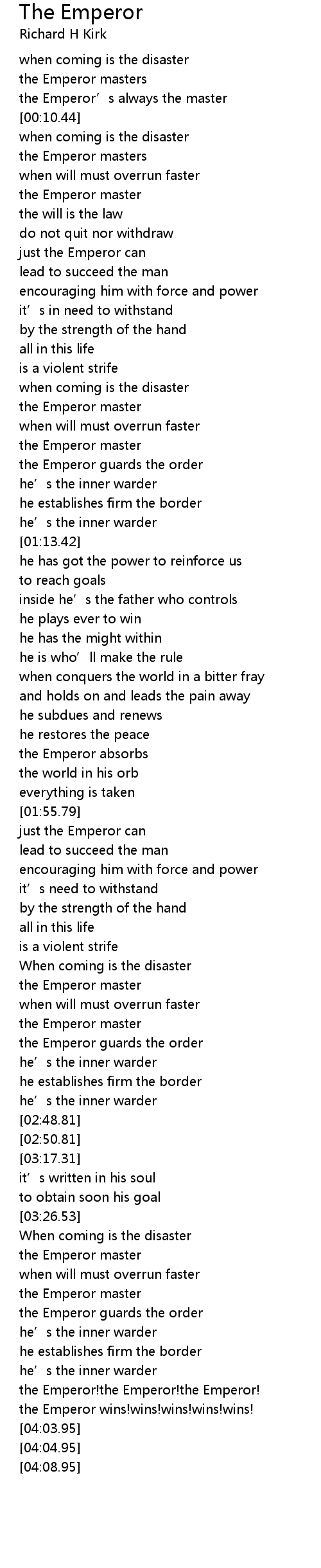 | [03:55.19] | the Emperor! the Emperor! the Emperor! |