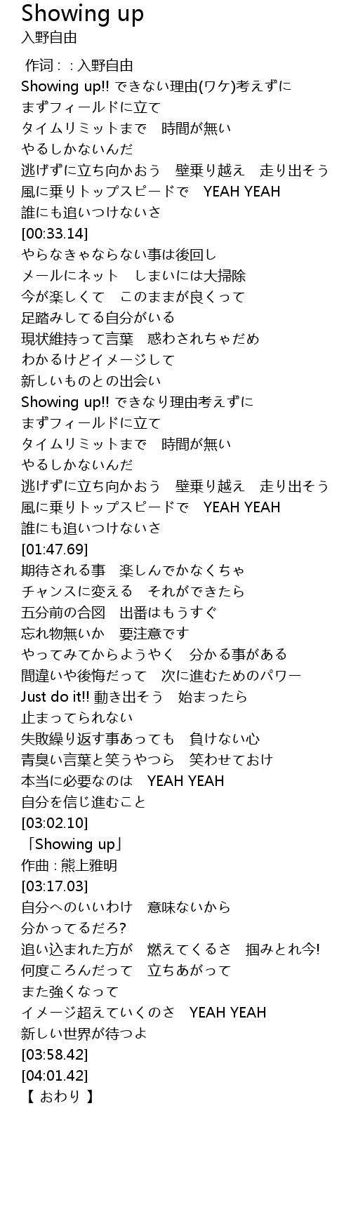 | [00:00.00] | Showing up!! できない理由(ワケ)考えずに |