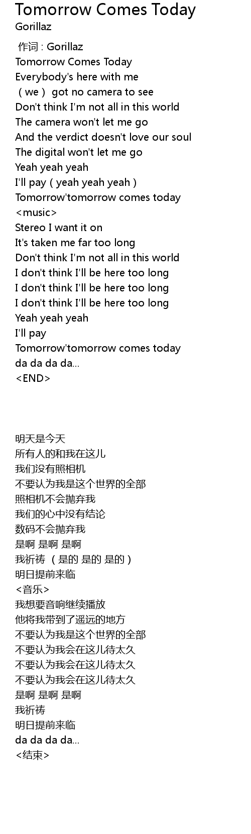 | [00:01.99] | Tomorrow Comes Today |
