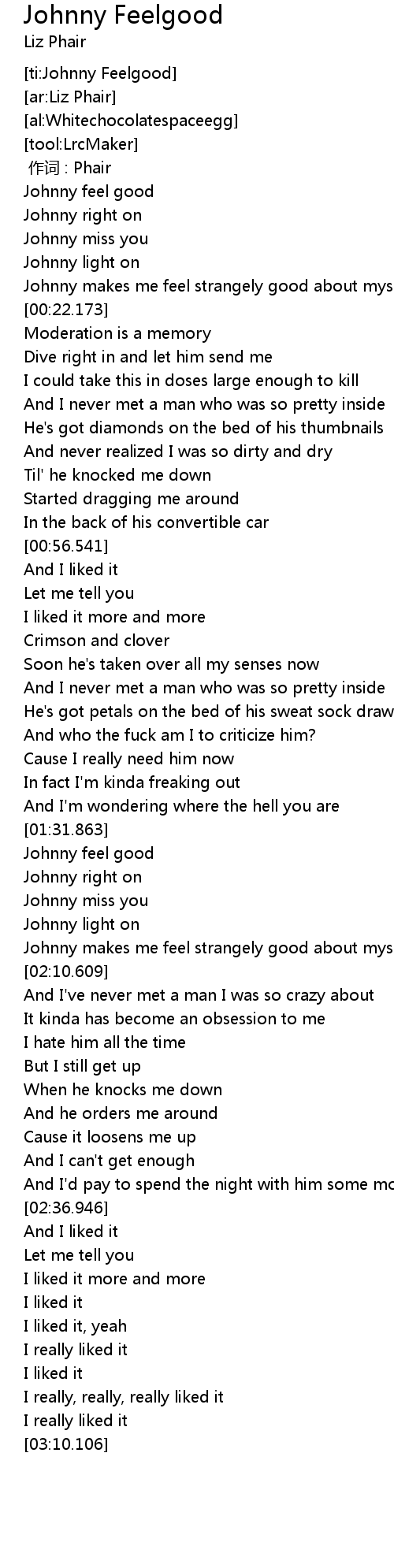 | [02:03.906] | Johnny makes me feel strangely good about myself |