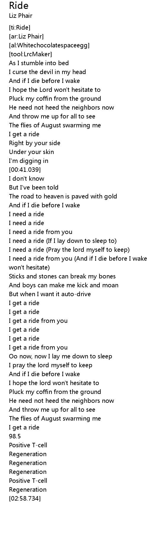 [01:11.499] I need a ride (Pray the lord myself to keep)
