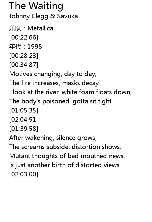 | [04:19.06][02:04.91][01:05.74] | The wait, the wait, the wait, the wait. |