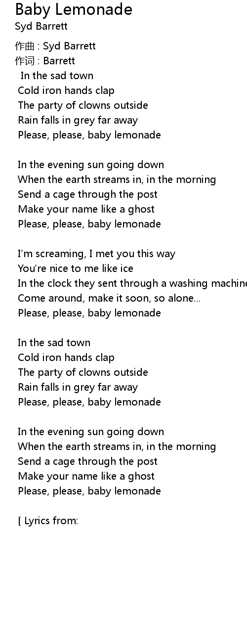 | Lyrics from: http: www. lyricsfreak. com s syd barret baby lemonade_20134739. html |