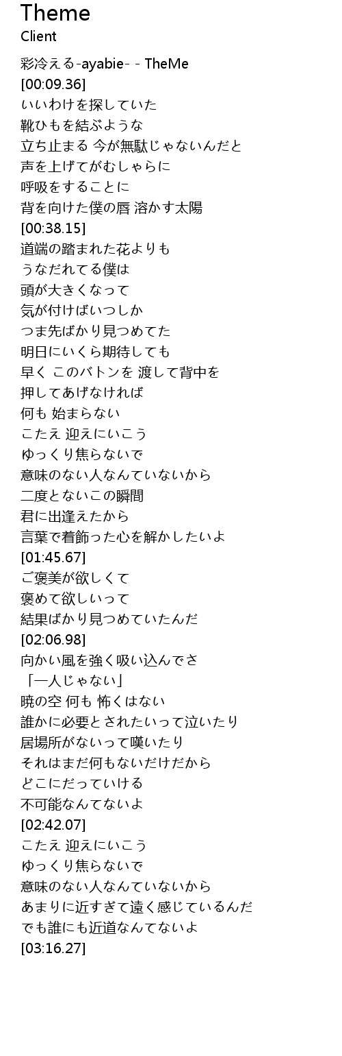 | [00:01.36] | 彩冷える-ayabie- - TheMe |