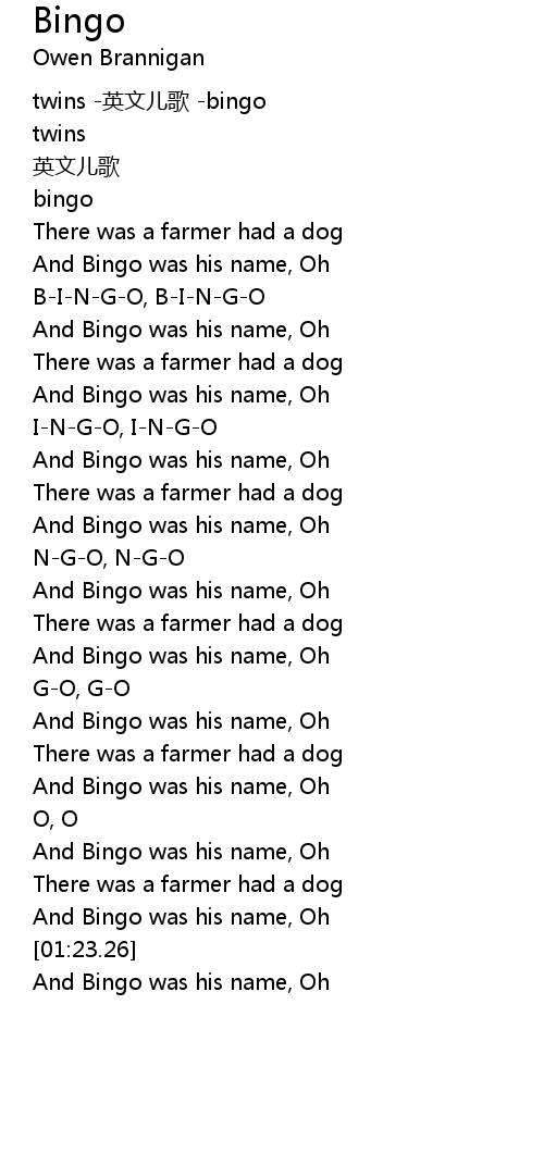 | [00:09.28] | B-I-N-G-O, B-I-N-G-O |