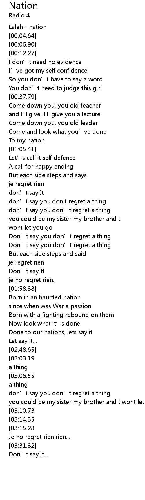 | [03:14.46][03:03.19][03:16.54][03:03.12][02:50.10] | don' t say you don t regret a thing |