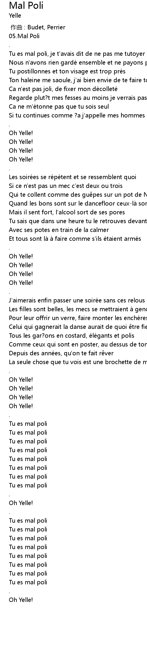 | [00:33.44] | Oh Yelle! |