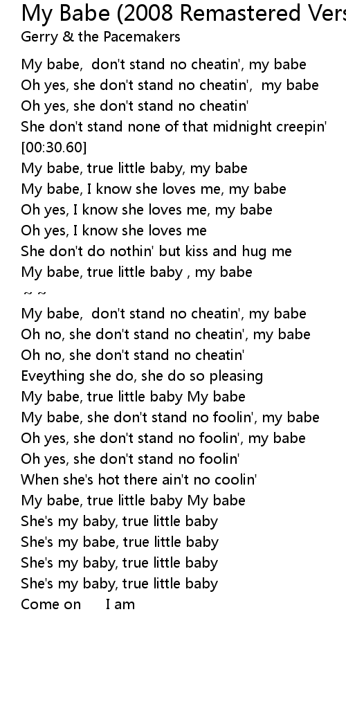| [00:18.49] | Oh yes, she don' t stand no cheatin', my babe |