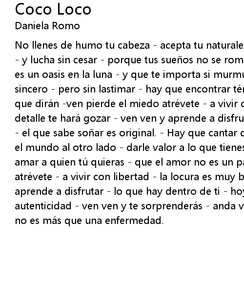 | No llenes de humo tu cabeza - acepta tu naturaleza - defiende siempre tus ideas - y lucha sin cesar - porque tus sueños no se rompan - como gotas de cristal - es un oasis en la luna - y que te importa si murmuran - ser verdadero y ser sincero - pero sin lastimar - hay que encontrar término medio - y a volar el que dirán -ven pierde el miedo atrévete - a vivir con libertad - descubrir un detalle te hará gozar - ven ven y aprende a disfrutar - lo que hay dentro de ti - el que sabe soñar es original. - Hay que cantar de de vez en cuando - mirar el mundo al otro lado - darle valor a lo que tienes - y no pedirte más - puedes amar a quien tú quieras - que el amor no es un papel - ven pierde miedo atrévete - a vivir con libertad - la locura es muy buena para reir - ven ven y aprende a disfrutar - lo que hay dentro de ti - hoy ya puedes probar - tu autenticidad - ven ven y te sorprenderás - anda ven descubrirás - la cordura no es más que una enfermedad. |
