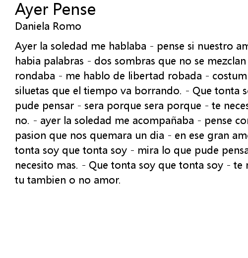 | Ayer la soledad me hablaba pense si nuestro amor se acab silencios en dond habia palabras dos sombras que no se mezclan nunca. ayer la soledad que me rondaba me hablo de libertad robada costumbres que se van desgastando siluetas que el tiempo va borrando. Que tonta soy que tonta soy mira lo que pude pensar sera porque sera porque te necesito mas y tu me quieres mas o no. ayer la soledad me acompa aba pense con una gran melancolia en la pasion que nos quemara un dia en ese gran amor que se volvio ternura. Que tonta soy que tonta soy mira lo que pude pensar sera porque sera porque te necesito mas. Que tonta soy que tonta soy te necesito mas y tu me quieres tu tambien o no amor. |