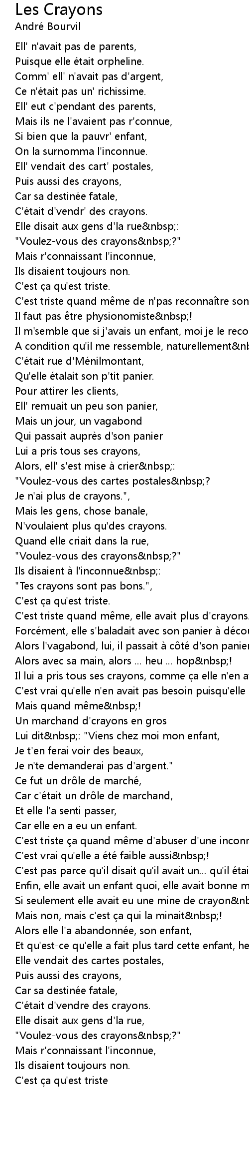 | C'est triste quand même, elle avait plus d'crayons. | |