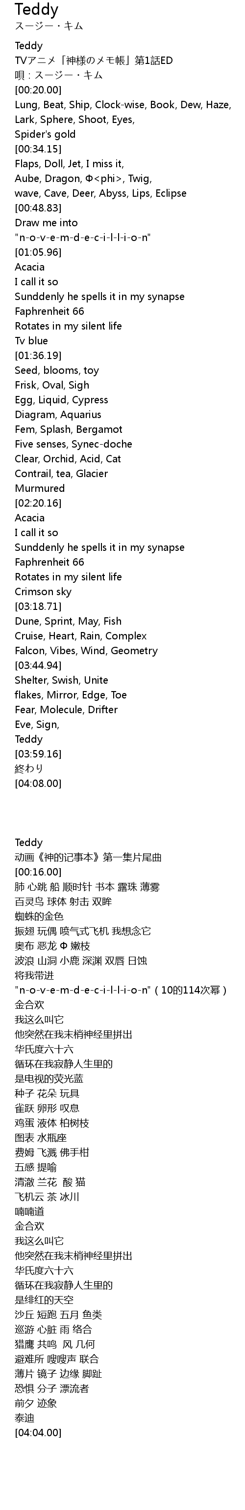 | [00:20.62] | Lung, Beat, Ship, Clock-wise, Book, Dew, Haze, |