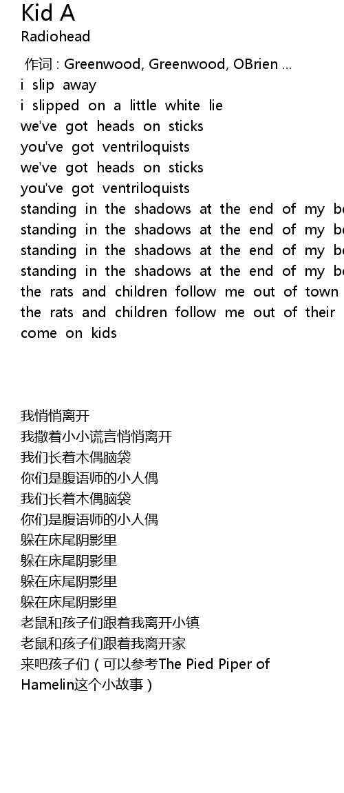 | [02:42.32] | 来吧孩子们(可以参考The Pied Piper of Hamelin这个小故事) |