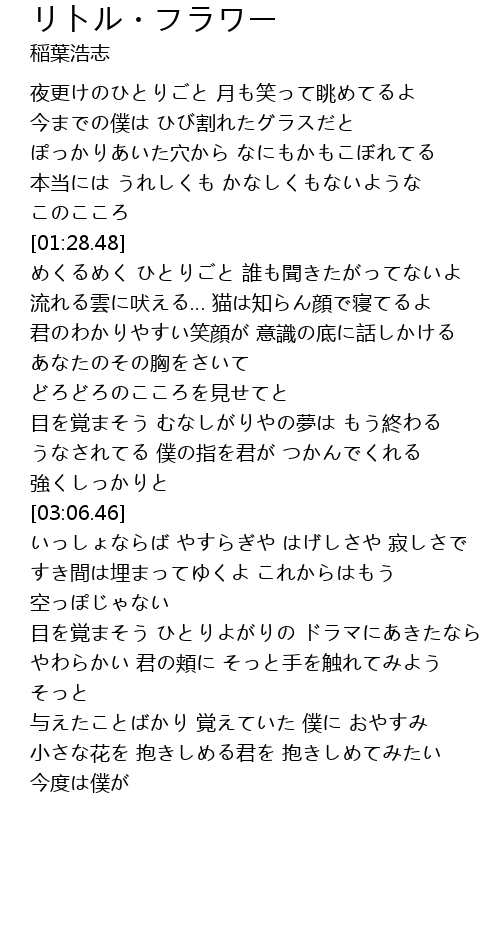 | [04:44.16] | 小さな花を 抱きしめる君を 抱きしめてみたい |