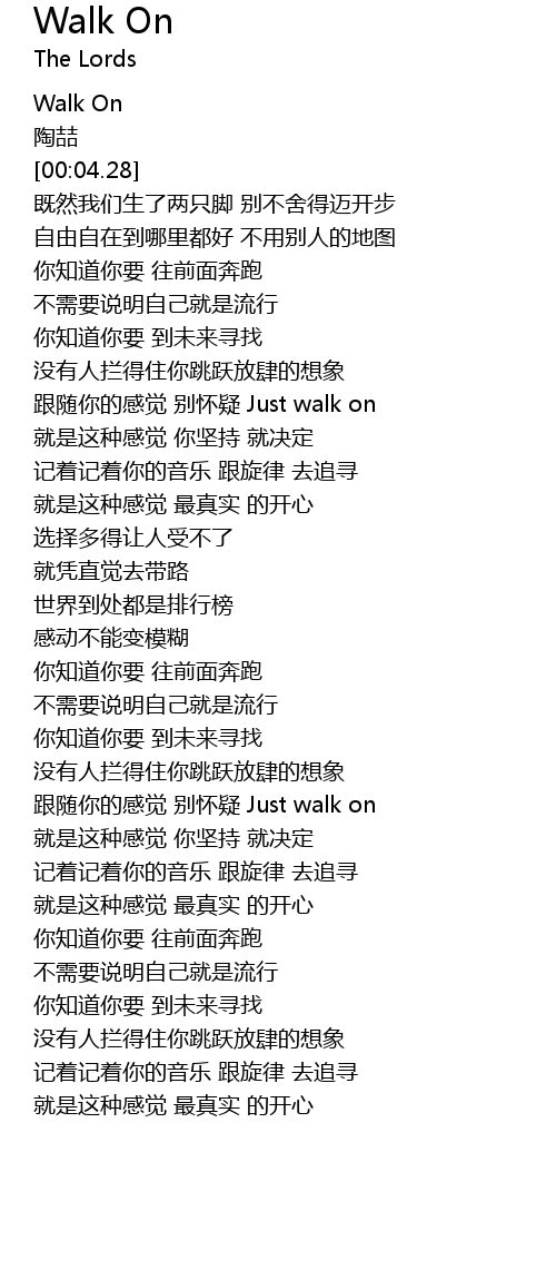 | [00:40.84] | 跟随你的感觉 别怀疑 Just walk on |