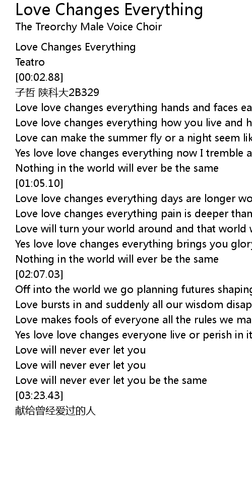 | [00:07.00] | Love love changes everything hands and faces earth and sky |