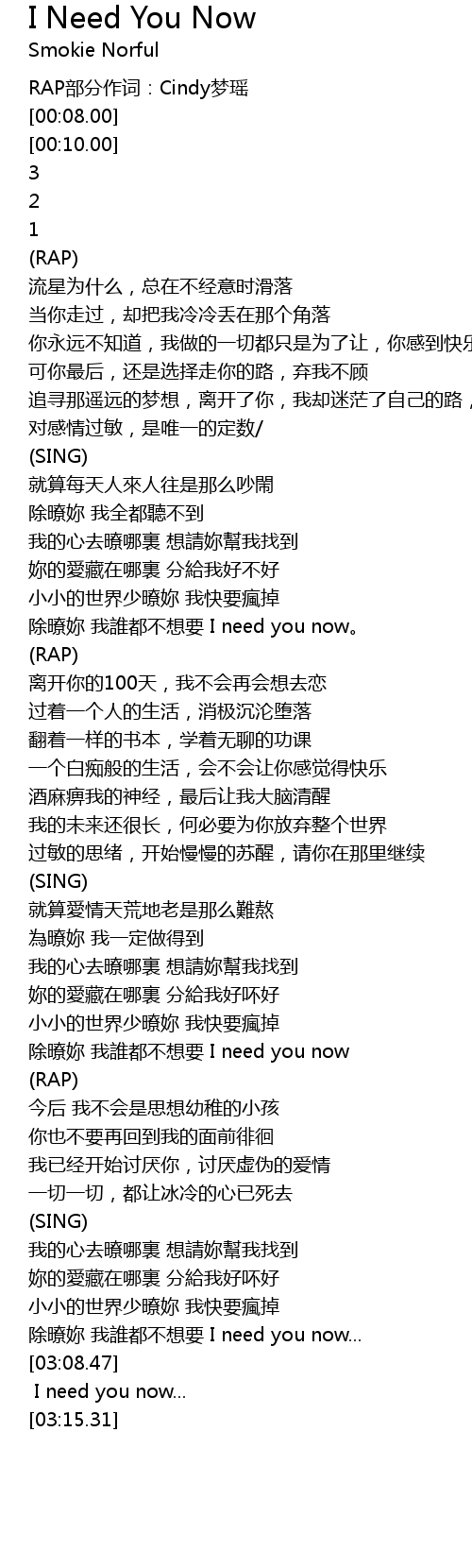 | [03:00.86] | chú liáo nǎi wǒ shuí dōu bù xiǎng yào I need you now... |
