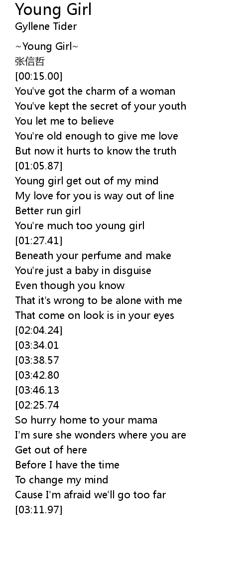 | [03:53.39][03:34.01][03:14.56][02:06.60] | Young girl get out of my mind |