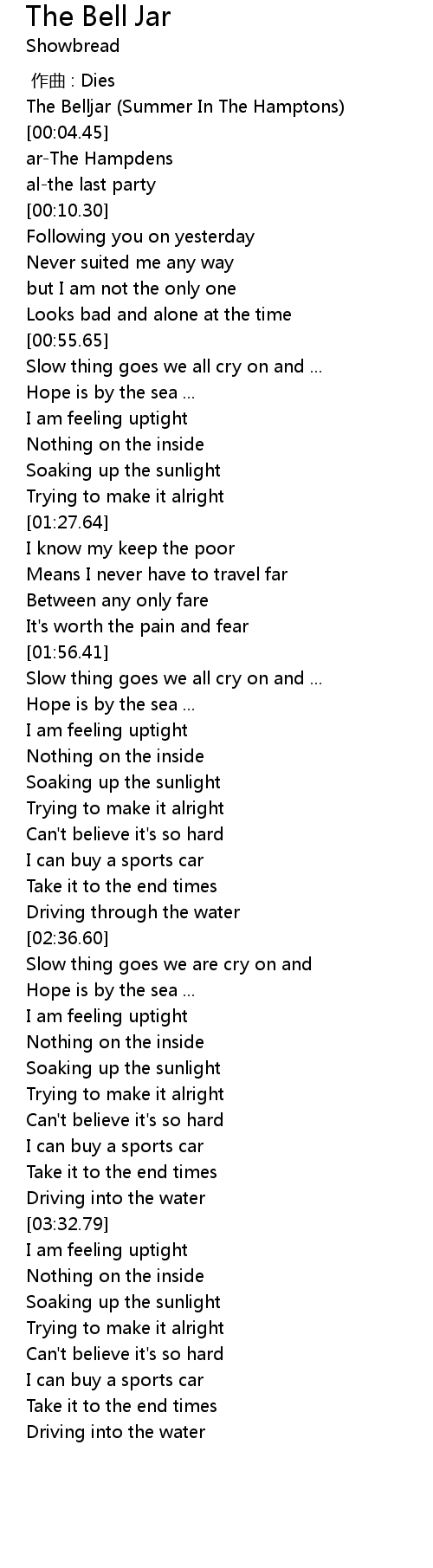 | [00:02.81] | The Belljar (Summer In The Hamptons) |