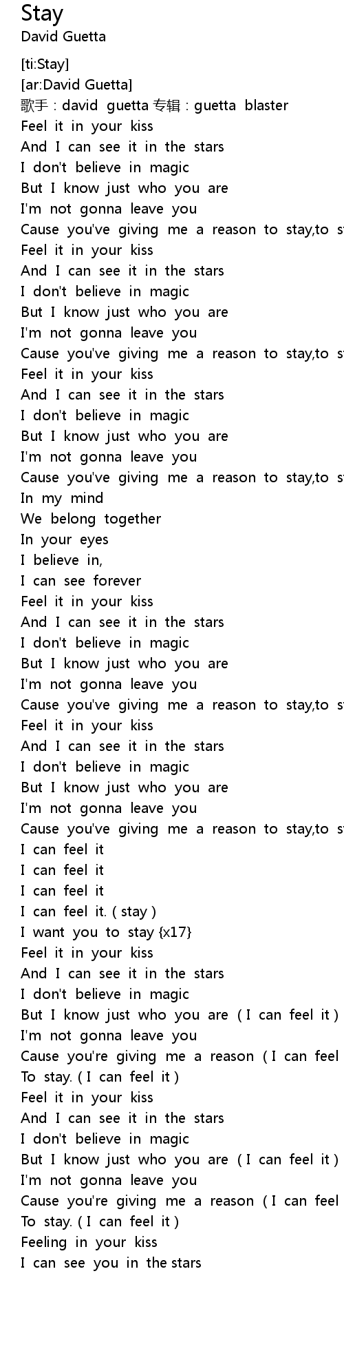 | [03:19.439] | Cause you're giving me a reason (I can feel it )to stay, |