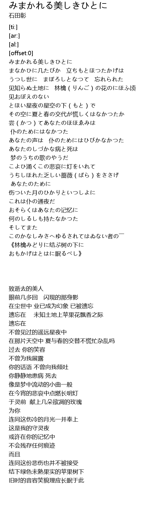 | [00:02.43] | みまかれる美しきひとに |
