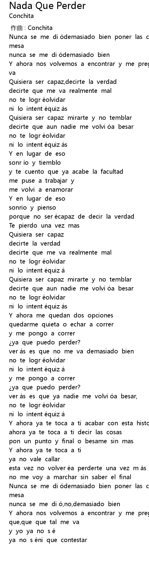 | [00:16.99] | Nunca se me di o demasiado bien poner las cartas sobre la mesa |