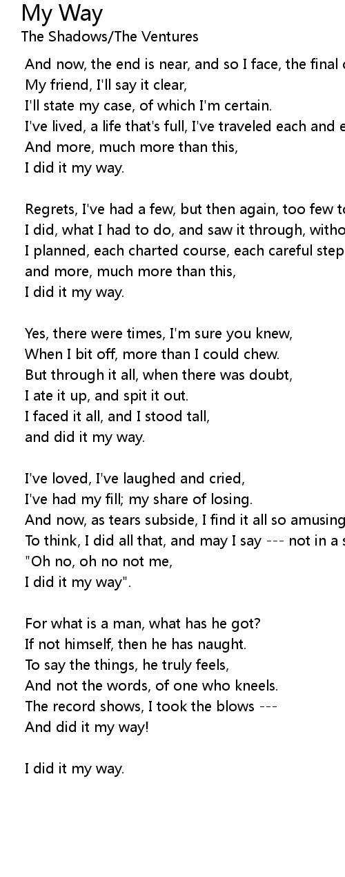 | I've lived, a life that's full, I've traveled each and every highway. | |