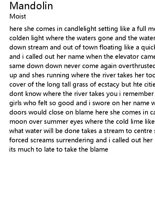 here she comes in candlelight setting like a full moon over summer eyes under colden light where the waters gone and the water says what water will be done down stream and out of town floating like a quick forced screams surrendering and i called out her name when the elevator came but its much to late to be the same down down never come again overthrusted drivin rain down down all the way up and shes running where the river takes her took your love into the street cover of the long tall grass of ecstacy but hte cities got to be my love and i dont know where the river takes you i remember hollywood battery of lonesome girls who felt so good and i swore on her name when the elevator came that the doors would close on blame here she comes in candle light setting like a full moon over summer eyes where the cold lime like a water gun and the water says what water will be done takes a stream to centre street wandering like a quick forced screams surrendering and i called out her name when the elevator came but its much to late to take the blame |