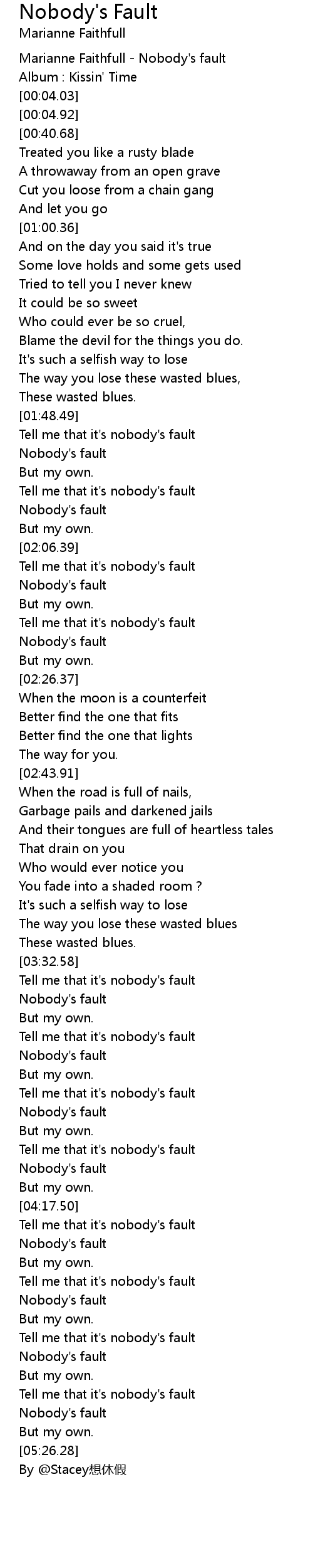 | [00:02.25] | Marianne Faithfull Nobody' s fault |