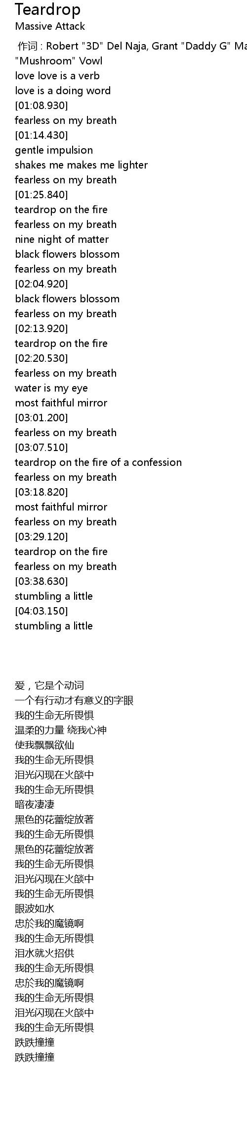 | [00:00.00] | zuò cí : Robert " 3D" Del Naja, Grant " Daddy G" Marshall, Andrew " Mushroom" Vowl |
