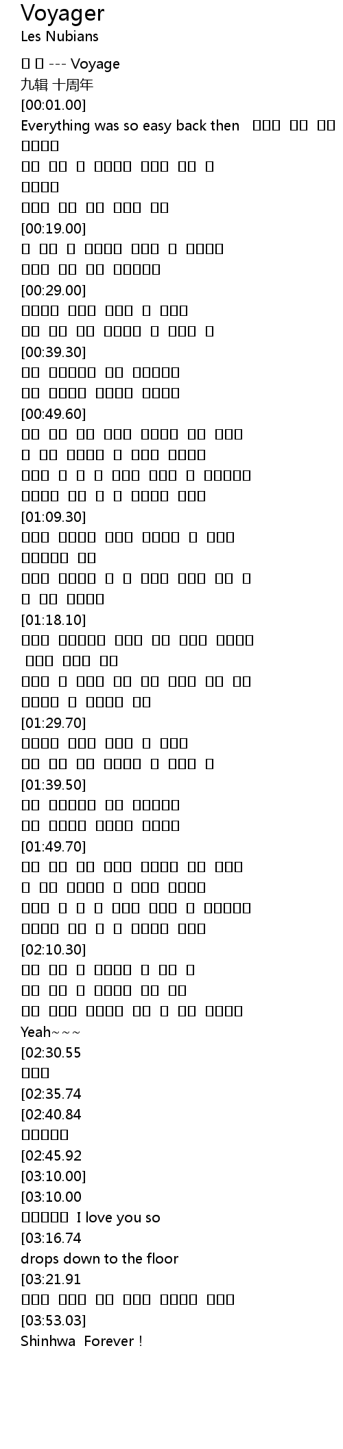 | [03:42.30][03:21.91] | 이젠 널 볼 수가 없다고 Say no more 한 순간만 이라도 너도 그때가 그림다고 말해줘 |