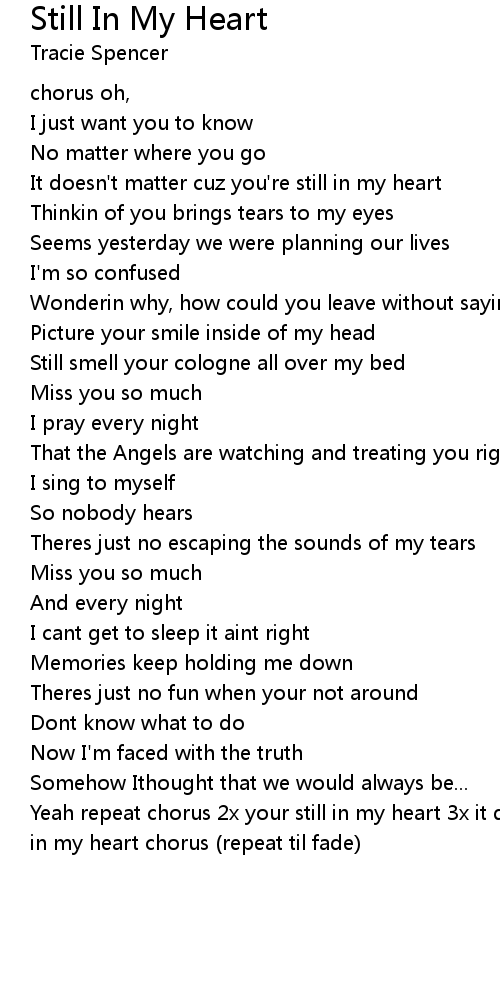 Yeah repeat chorus 2x your still in my heart 3x it doesn't matter cuz your still in my heart chorus (repeat til fade) |
