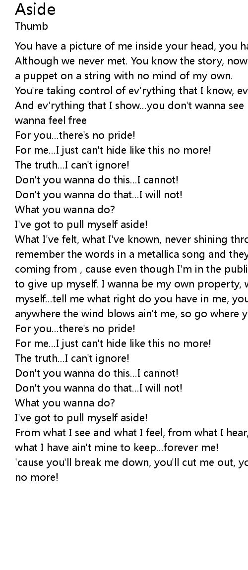 | And ev'rything that I show...you don't wanna see me, the way I wanna see me, I wanna feel free | |