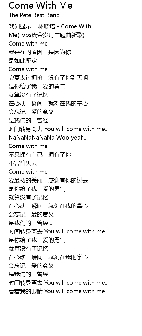 | [00:00.72] | gē cí xiǎn shì lín xiǎo péi Come With Me Tvbs liú jīn suì yuè zhǔ tí qū xīn gē |