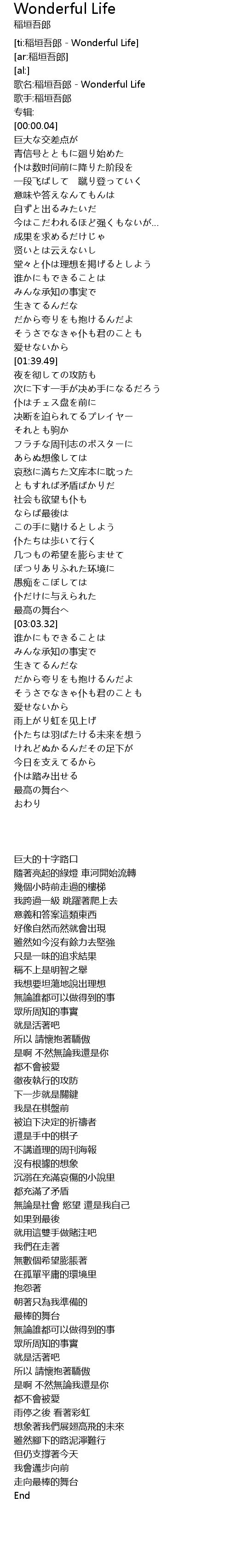 | [00:00.00] | 歌名:稲垣吾郎 - Wonderful Life |