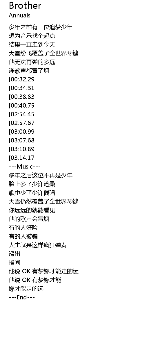| [03:20.80][02:54.45][02:14.63][00:48.61] | 哥哥说 Byebye My Brother |