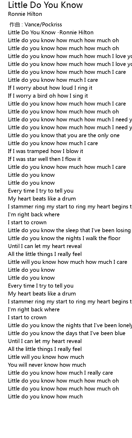 | [00:00.458] | Little Do You Know -Ronnie Hilton |