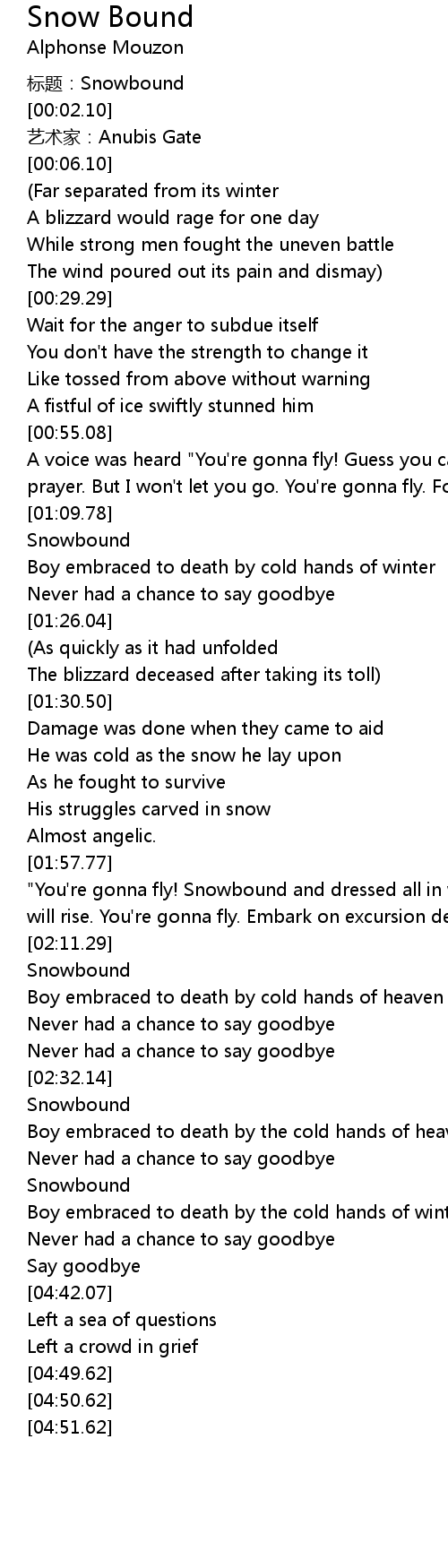 | [01:58.17] | "You're gonna fly! Snowbound and dressed all in white. But your spirit will rise. You're gonna fly. Embark on excursion demise." |