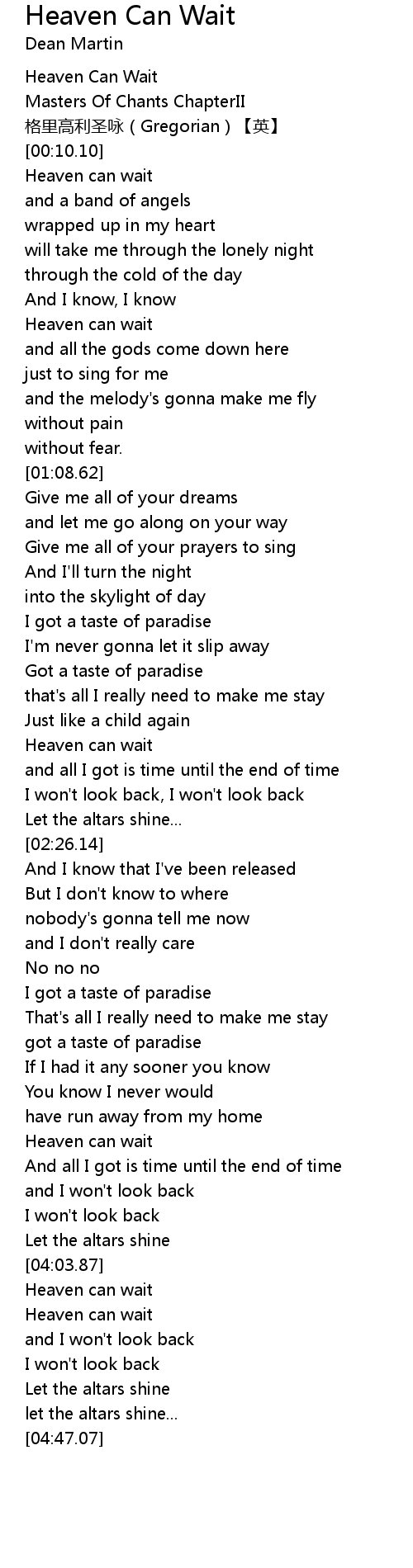 | [04:10.06] | Heaven can wait |