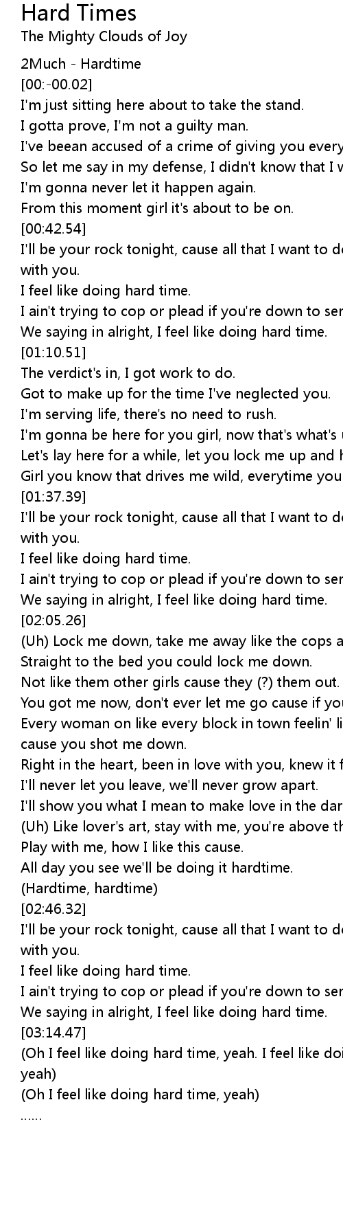 | [03:14.80] | Oh I feel like doing hard time, yeah. I feel like doing hard time, yeah |