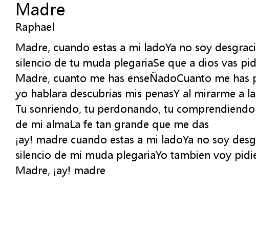| Madre, cuanto me has enseÑadoCuanto me has perdonado con divina bondadSin que yo hablara descubrias mis penasY al mirarme a la cara me llenabas de paz | |