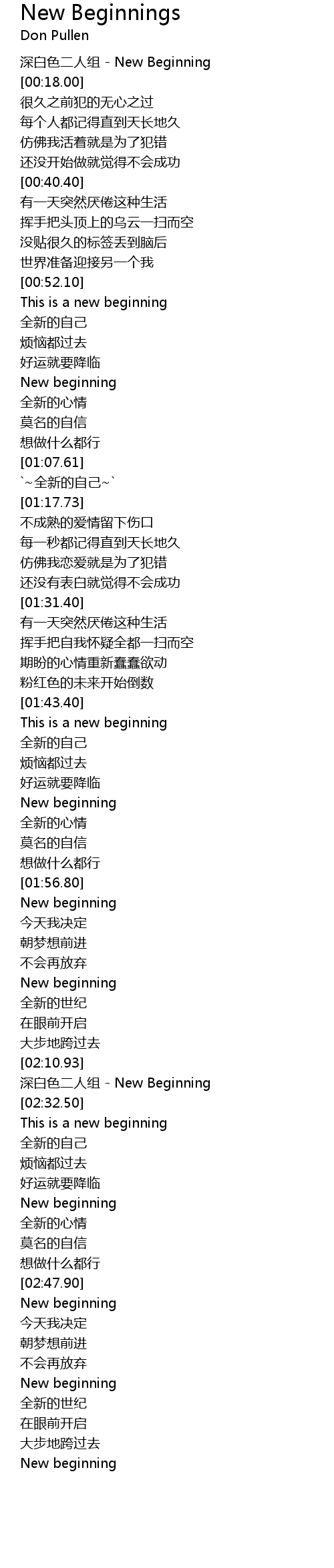 | [02:22.50] | shēn bái sè èr rén zǔ New Beginning |