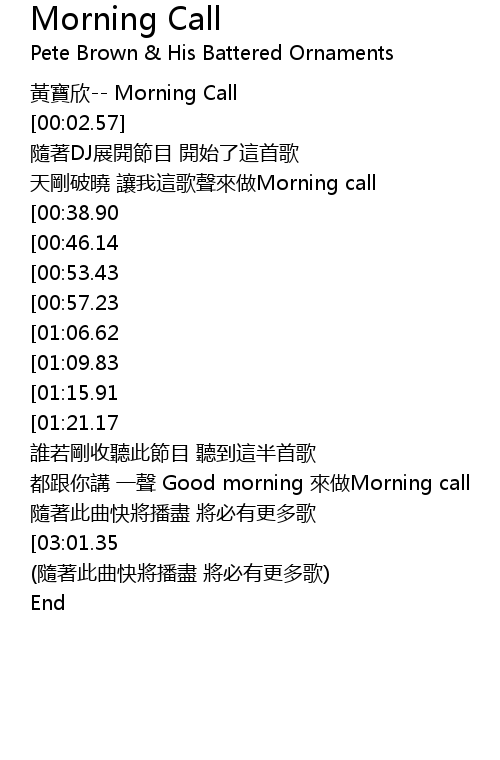 | [02:37.75][01:15.91] | Morning call 愿爭取每一分每一秒做到 |