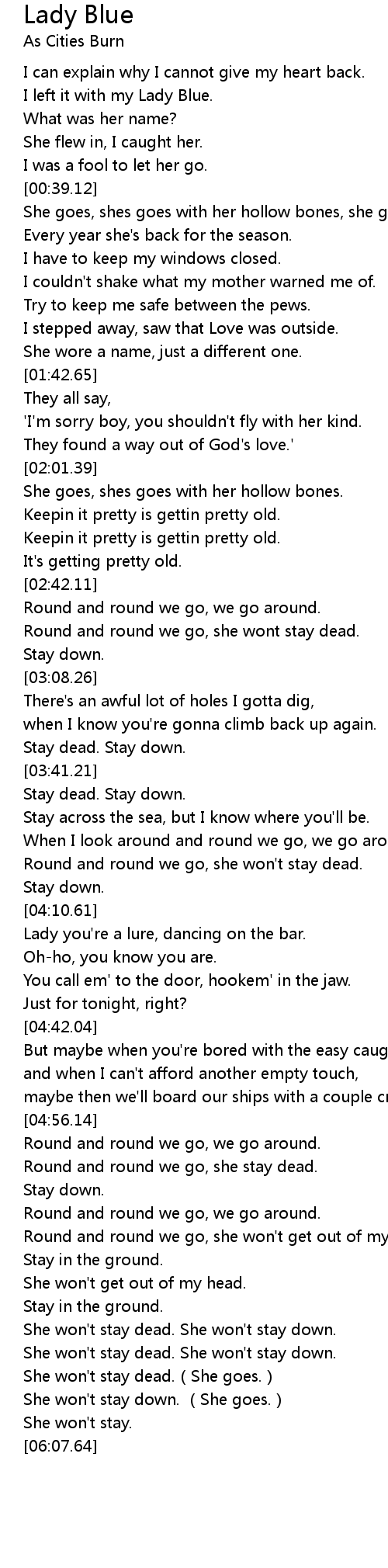 | [06:03.79] | She won' t stay. |