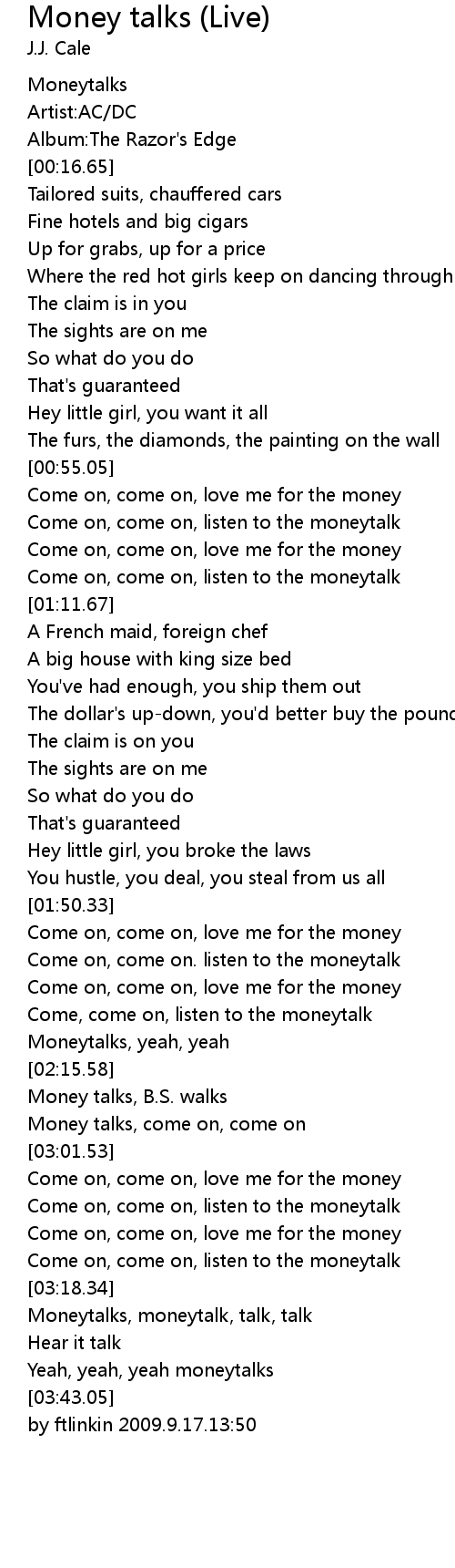 | [03:20.79] | Moneytalks, moneytalk, talk, talk |