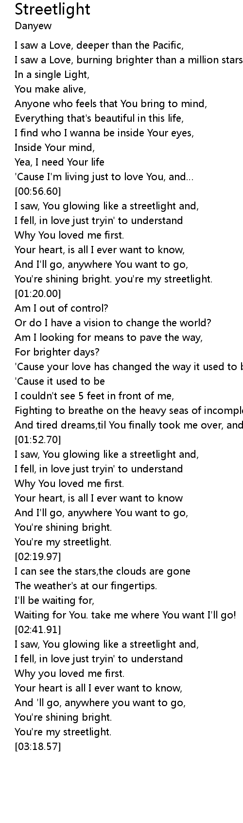 | [00:57.14] | I saw, You glowing like a streetlight and, |